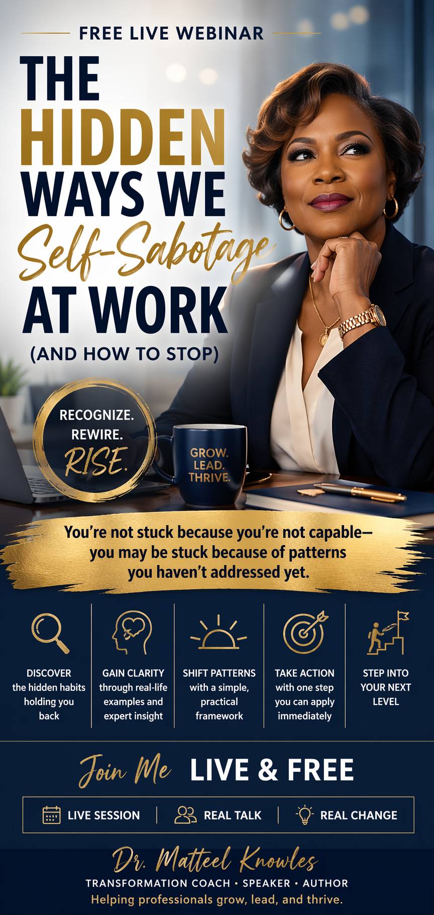 In this free webinar, Dr. Matteel Knowles uncovers the subtle, often overlooked habits that can quietly derail your success at work. Through real-life examples and practical insights, you’ll learn how to recognize these patterns—and take the first steps toward meaningful, lasting change.